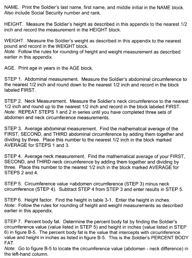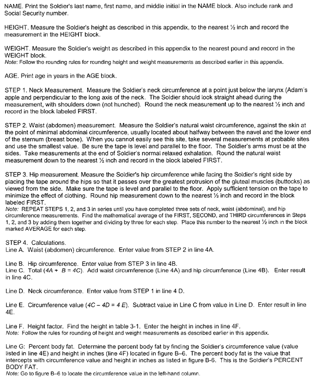 a. The procedures for the measurements of height, weight, and specific body circumferences for the estimation of body fat are described in this appendix.