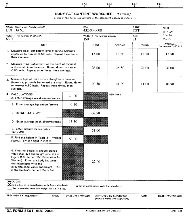 b. Although circumferences may be looked upon by untrained personnel as easy measures, they can give erroneous results if proper precautions are not followed. The individual taking the measurements must have a thorough understanding of the appropriate body landmarks and measurement techniques. Unit commanders will require that designated personnel have hands-on training and read the instructions regarding technique and location and practice before official determinations are made. Two members of the unit will be utilized in the taking of measurements, one to place the tape measure and determine measurements, the other to assure proper placement and tension of the tape, as well as to record the measurement on the worksheet (DA Form 5500 (Body Fat Content Worksheet (Male) and DA Form 5501 (Body Fat Content Worksheet (Female)). The individual taking the measurements will be of the same sex as the Soldier being measured; the individual who assists the measurer and does the recording may be of either sex. The two will work with the Soldier between them so the tape is clearly visible from all sides. Take all circumference measurements three times and record them to the nearest 1⁄2 inch. If any one of the three closest measurements differs by more than 1 inch from the other two, take an additional measurement and compute a mathematical average of the three measurements with the least difference to the nearest 1⁄2 inch and record this value.